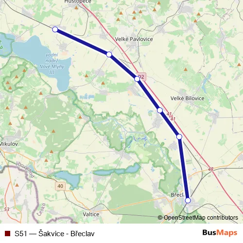 The first stop of the S51 rail route is Šakvice, železniční stanice and the last stop is Břeclav, autobusové nádraží. S51 (Šakvice - Břeclav) is operational during ежедневно.