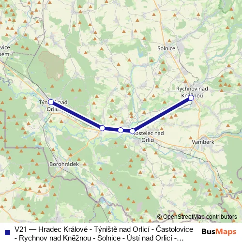 Click here to view the nearest V21 - Hradec Králové - Týniště nad Orlicí - Častolovice - Rychnov nad Kněžnou - Solnice - Ústí nad Orlicí - Letohrad rail stop.
