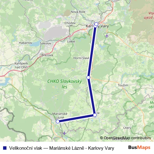 The first stop of the Velikonoční vlak rail route is Mariánské Lázně and the last stop is Karlovy Vary. Velikonoční vlak (Mariánské Lázně - Karlovy Vary) is operational during ежедневно.