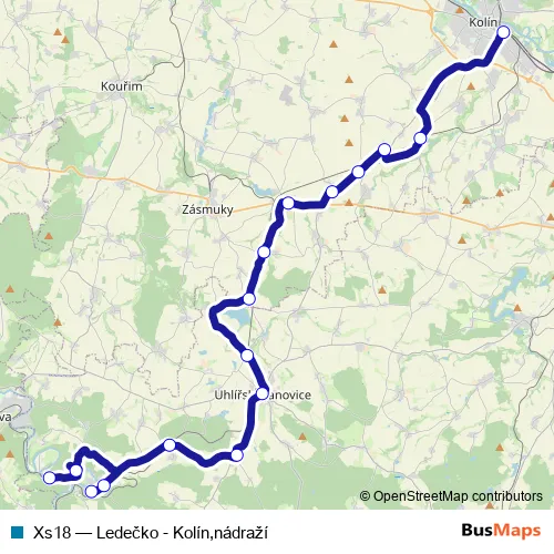 The first stop of the Xs18 bus route is Ledečko and the last stop is Kolín,nádraží. Xs18 (Ledečko - Kolín,nádraží) is operational during ежедневно.