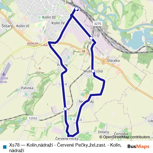 The first stop of the Xs78 bus route is Kolín,nádraží and the last stop is Kolín,nádraží. Xs78 (Kolín,nádraží - Červené Pečky,žel.zast. - Kolín,nádraží) is operational during ежедневно.