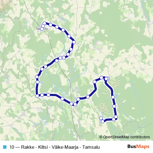 The first stop of the 10 bus route is Salla mõis and the last stop is Tamsalu. 10 (Rakke - Kiltsi - Väike-Maarja - Tamsalu) is operational during ежедневно.
