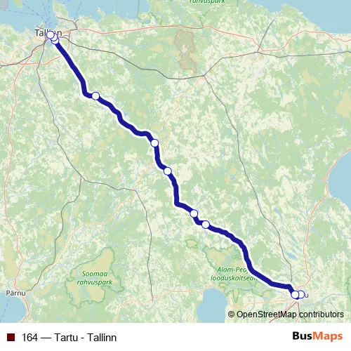 The first stop of the 164 bus route is Tartu bussijaam and the last stop is Tallinna bussijaam. 164 (Tartu - Tallinn) is operational during ежедневно.