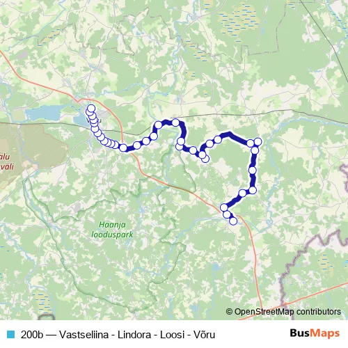 The first stop of the 200b bus route is Vastseliina and the last stop is Võru bussijaam. 200b (Vastseliina - Lindora - Loosi - Võru) is operational during по выходным.