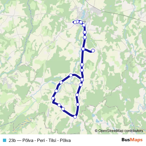 The first stop of the 23b bus route is Põlva bussijaam and the last stop is Põlva bussijaam. 23b (Põlva - Peri - Tilsi - Põlva) is operational during по выходным.