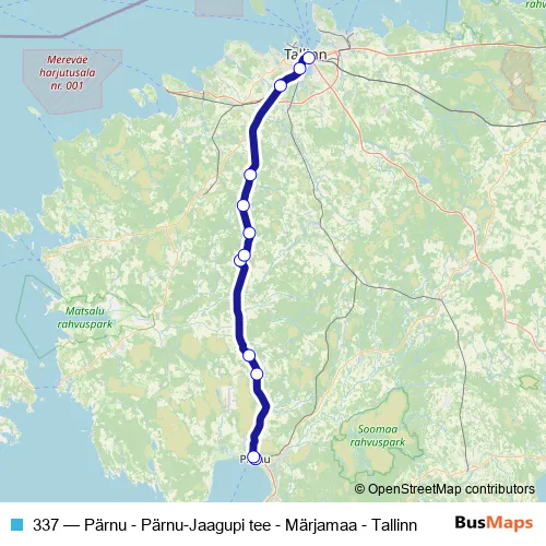The first stop of the 337 bus route is Pärnu bussijaam and the last stop is Tallinna bussijaam. 337 (Pärnu - Pärnu-Jaagupi tee - Märjamaa - Tallinn) is operational during ежедневно.
