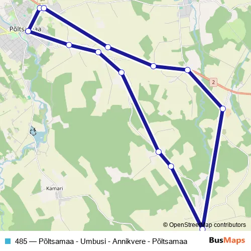The first stop of the 485 bus route is Põltsamaa and the last stop is Põltsamaa. 485 (Põltsamaa - Umbusi - Annikvere - Põltsamaa) is operational during ежедневно.