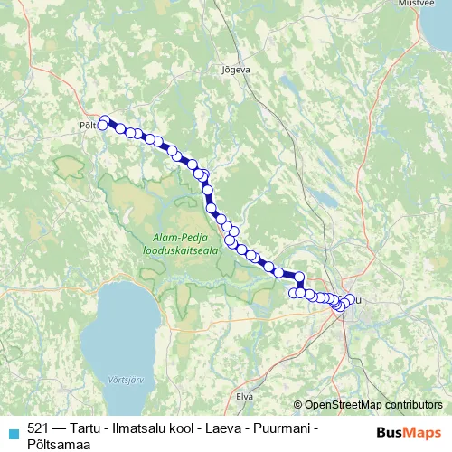 The first stop of the 521 bus route is Tartu bussijaam and the last stop is Põltsamaa. 521 (Tartu - Ilmatsalu kool - Laeva - Puurmani - Põltsamaa) is operational during ежедневно.