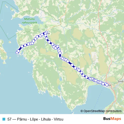The first stop of the 57 bus route is Virtsu sadam and the last stop is Pärnu bussijaam. 57 (Pärnu - Lõpe - Lihula - Virtsu) is operational during ежедневно.
