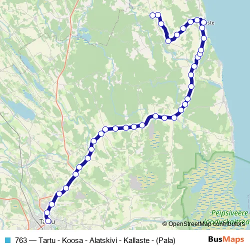 The first stop of the 763 bus route is Tartu bussijaam and the last stop is Pala. 763 (Tartu - Koosa - Alatskivi - Kallaste - (Pala)) is operational during ежедневно.