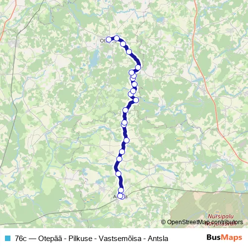 The first stop of the 76c bus route is Antsla and the last stop is Otepää. 76c (Otepää - Pilkuse - Vastsemõisa - Antsla) is operational during ежедневно.