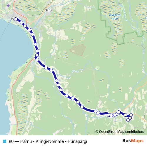 The first stop of the 86 bus route is Pärnu bussijaam and the last stop is Punapargi. 86 (Pärnu - Kilingi-Nõmme - Punapargi) is operational during ежедневно.
