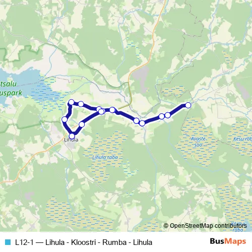 The first stop of the L12-1 bus route is Lihula and the last stop is Lihula. L12-1 (Lihula - Kloostri - Rumba - Lihula) is operational during по будням.