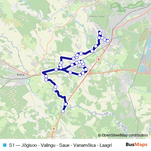 The first stop of the S1 bus route is Jõgisoo and the last stop is Laagri kool. S1 (Jõgisoo - Valingu - Saue - Vanamõisa - Laagri) is operational during по будням.