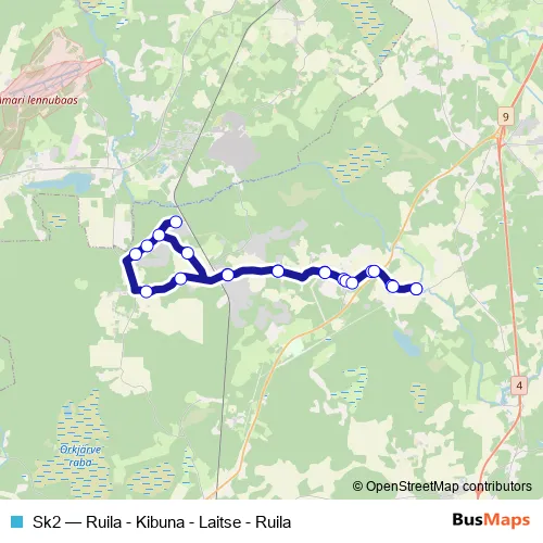 The first stop of the Sk2 bus route is Ruila kool and the last stop is Ruila kool. Sk2 (Ruila - Kibuna - Laitse - Ruila) is operational during по будням.
