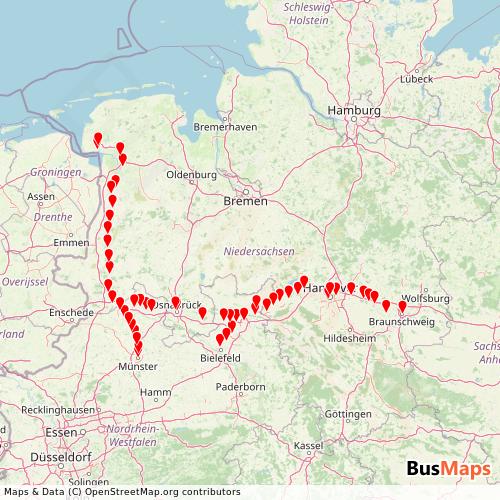 Transit Data for Germany by Westfalenbahn with Stops on Map