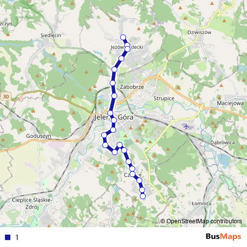 Wrzosowa - Czarnoleska - Strumykowa - Elizy Orzeszkowej - Adama Mickiewicza - Bartosza Głowackiego - Gustawa Morcinka - Leona Wyczółkowskiego - Wolności - Aleja Wojska Polskiego - Bankowa - Podwale - Grunwaldzka - Podchorążych - Długa