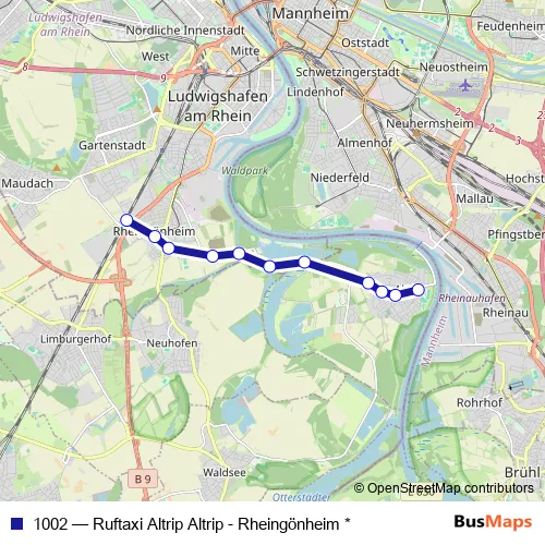 The first stop of the 1002 bus route is Rheingönheim, Bahnhof and the last stop is Altrip, Ludwigsplatz. 1002 (Ruftaxi Altrip Altrip - Rheingönheim *) is operational during ежедневно.