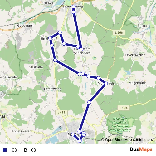 The first stop of the 103 bus route is Pfullendorf, Zob and the last stop is Krauchenwies, Rathaus. 103 (B 103) is operational during по будням.