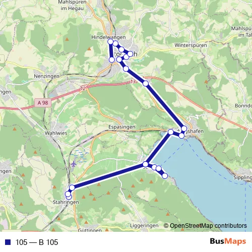 The first stop of the 105 bus route is Stahringen, Bahnhof and the last stop is Stockach (KN), Busbahnhof. 105 (B 105) is operational during по будням.