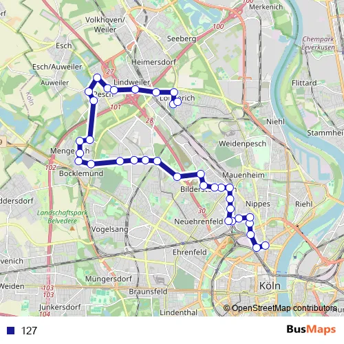 See why over 2 million users trust and consider busmaps.com as the best public transport website. busmaps gives you Koeln Buses suggested routes, real-time bus tracker, line route maps in Koeln, and helps to find the closest 127 bus stops near you. No internet available? Download an offline PDF map and bus schedule for the 127 bus to take on your trip.