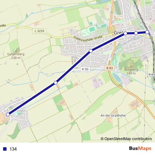 The first stop of the 134 bus route is Grebenstein Bahnhof Vorplatz and the last stop is Grebenstein Schachten Schachten. 134 is operational during ежедневно.