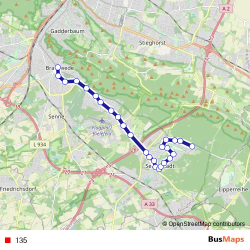 The first stop of the 135 bus route is Bielefeld, Brackwede Kirche Steig A and the last stop is Bi-Sennestadt, Württemberger Allee. 135 is operational during ежедневно.