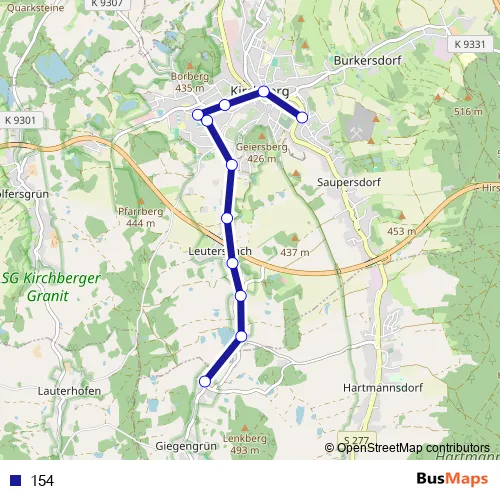 The first stop of the 154 bus route is Kirchberg, Wartehalle and the last stop is Giegengrün, Wendestelle. 154 is operational during по будням.