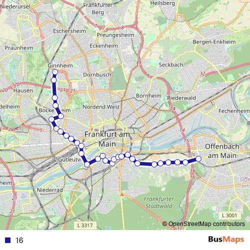 See why over 2 million users trust and consider busmaps.com as the best public transport website. busmaps gives you Frankfurt am Main Trams suggested routes, real-time bus tracker, line route maps in Frankfurt am Main, and helps to find the closest 16 tram stops near you. No internet available? Download an offline PDF map and bus schedule for the 16 tram to take on your trip.