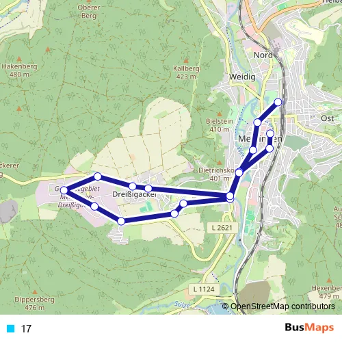 The first stop of the 17 bus route is Meiningen, Busbahnhof and the last stop is Meiningen, Sachsenstraße/Stadtzentrum. 17 is operational during ежедневно.