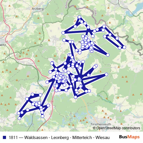 The first stop of the 1811 bus route is Hatzenreuth and the last stop is Wiesau (Oberpf) Bahnhof. 1811 (Waldsassen - Leonberg - Mitterteich - Wiesau) is operational during ежедневно.