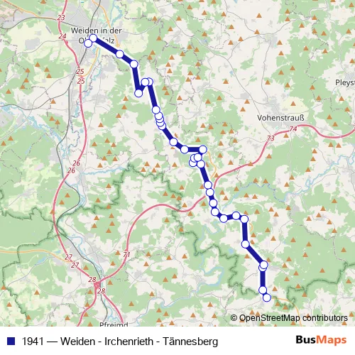 The first stop of the 1941 bus route is Pilchau B 22 and the last stop is Weiden Bahnhof. 1941 (Weiden - Irchenrieth - Tännesberg) is operational during ежедневно.