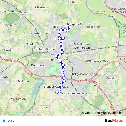 The first stop of the 205 bus route is Delmenhorst Bungerhof and the last stop is Delmenhorst Danziger Straße. 205 is operational during ежедневно.