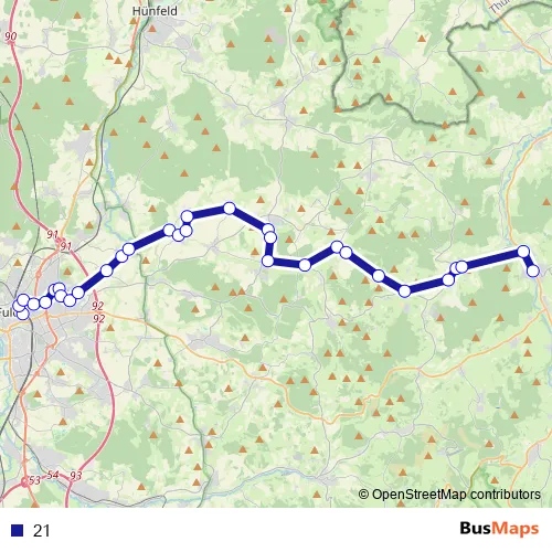 The first stop of the 21 bus route is Fulda Bahnhof/Zob and the last stop is Hilders Zob. 21 is operational during по будням.