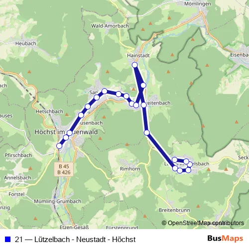 The first stop of the 21 bus route is Höchst (Odw), Bahnhof and the last stop is Lützelbach, Hardt-Siedlung. 21 (Lützelbach - Neustadt - Höchst) is operational during ежедневно.