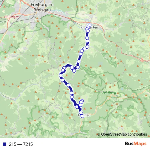 The first stop of the 215 bus route is Kirchzarten Bf (Bus) and the last stop is Todtnau Busbahnhof. 215 (7215) is operational during ежедневно.