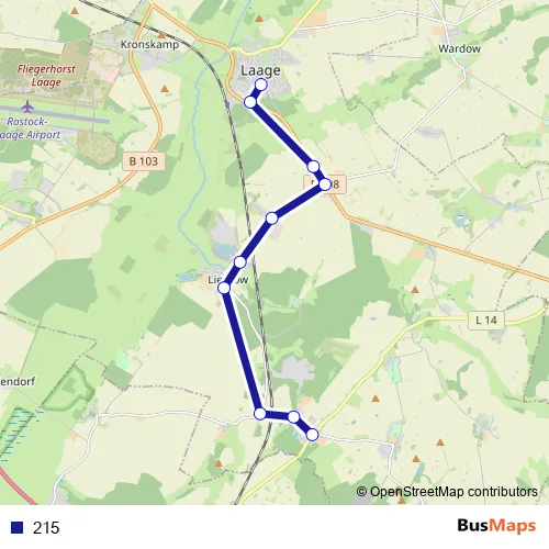 The first stop of the 215 bus route is Laage, Breesener Straße and the last stop is Diekhof, Siedlung. 215 is operational during по будням.