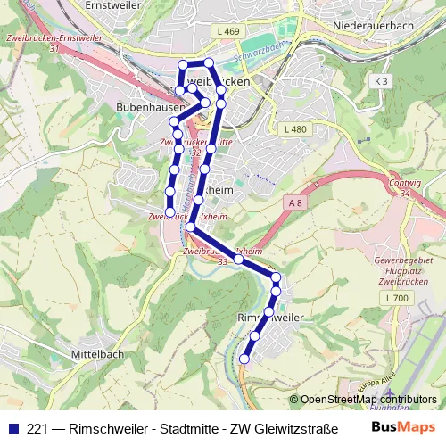 The first stop of the 221 bus route is Rimschweiler, Endstelle and the last stop is Zweibrücken, Gleiwitzstraße. 221 (Rimschweiler - Stadtmitte - ZW Gleiwitzstraße) is operational during ежедневно.