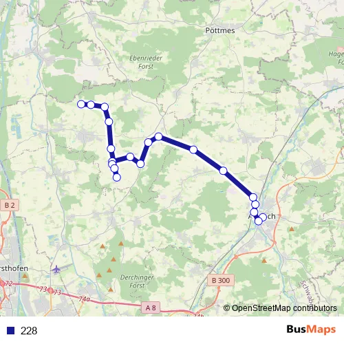 The first stop of the 228 bus route is Aichach, Martinstraße and the last stop is Edenhausen. 228 is operational during по будням.