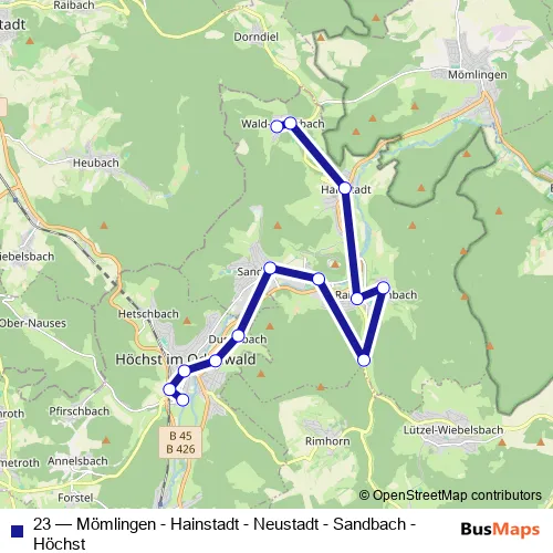 The first stop of the 23 bus route is Höchst, Grundschule and the last stop is Wald-Amorbach, Markt. 23 (Mömlingen - Hainstadt - Neustadt - Sandbach - Höchst) is operational during по будням.