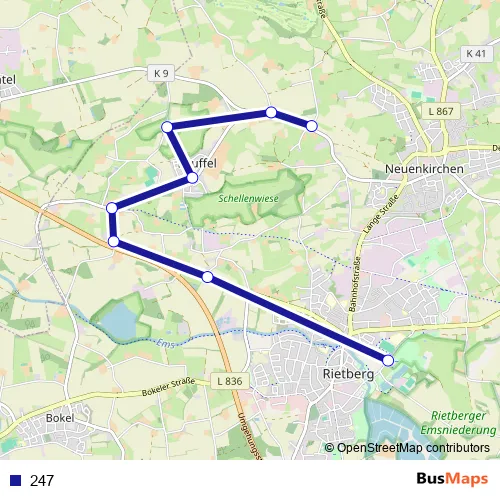 The first stop of the 247 bus route is Rietberg, Zob and the last stop is Rb-Druffel, Wimmelbücker. 247 is operational during по будням.