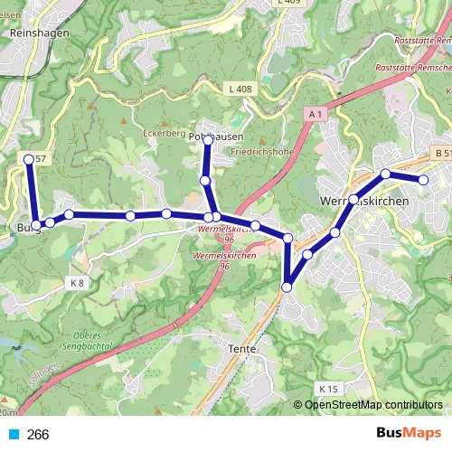 The first stop of the 266 tram route is Wermelskirchen Busbf and the last stop is Solingen Burger Bahnhof Bstg 1. 266 is operational during ежедневно.