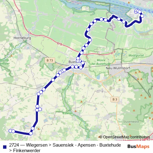 The first stop of the 2724 bus route is Wiegersen, Schusterstraße and the last stop is Airbus(Osttor/Einfahrt-nur für Betriebsangehörige). 2724 (Wiegersen > Sauensiek - Apensen - Buxtehude > Finkenwerder) is operational during по будням.
