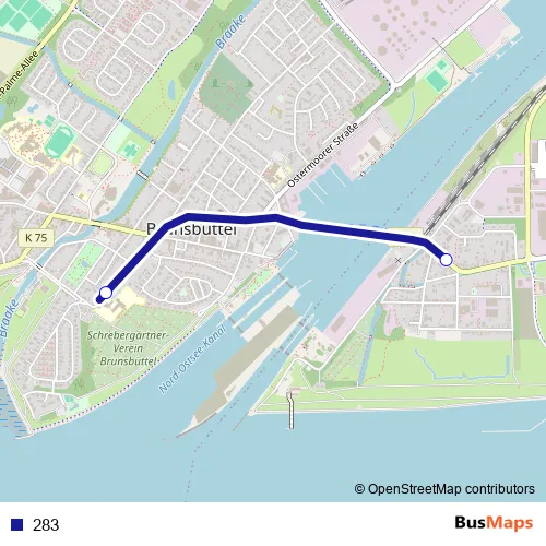 The first stop of the 283 bus route is Brunsbüttel Boy-Lornsen-Grundschule and the last stop is Brunsbüttel Süd/Fährstraße. 283 is operational during по будням.