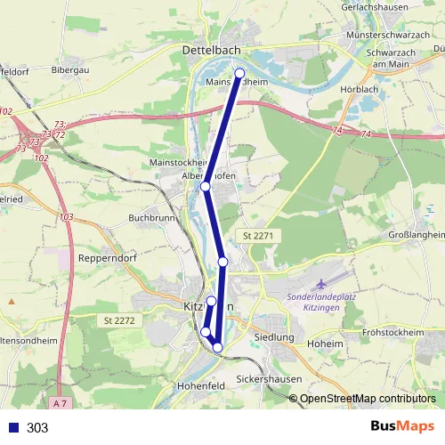 The first stop of the 303 bus route is Kitzingen Rathaus and the last stop is Mainsondheim Am Schloss. 303 is operational during по будням.