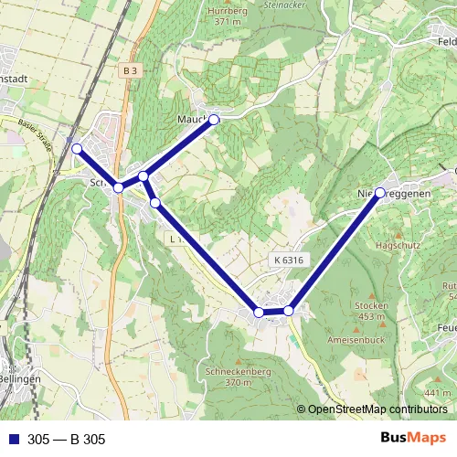 The first stop of the 305 bus route is Schliengen, Eisenbahnstrasse and the last stop is Niedereggenen, Unterdorf. 305 (B 305) is operational during по будням.