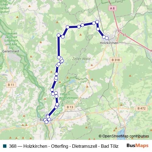 The first stop of the 368 bus route is Bad Tölz, ZOB Isarkai and the last stop is Dietramszell, Schönegg. 368 (Holzkirchen - Otterfing - Dietramszell - Bad Tölz) is operational during ежедневно.