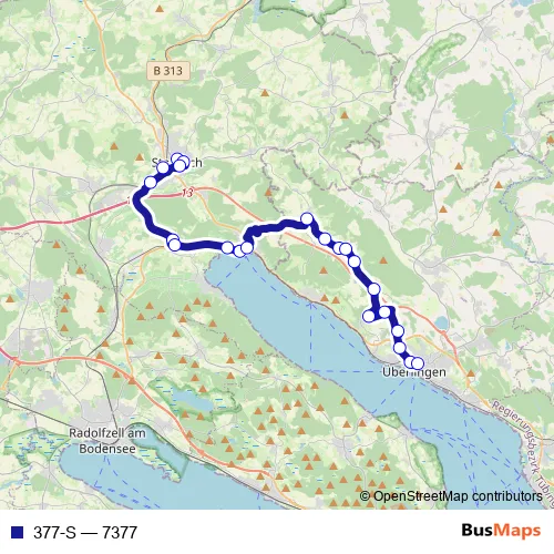 The first stop of the 377-S bus route is Stockach, Grundschule and the last stop is Überlingen, Busbahnhof. 377-S (7377) is operational during по будням.