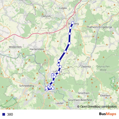 The first stop of the 380 bus route is Stollberg, Bahnhof and the last stop is Aue, Bahnhofsvorplatz. 380 is operational during ежедневно.