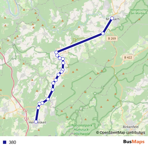 The first stop of the 380 bus route is Morbach, Zob and the last stop is Hermeskeil, Donatusplatz. 380 is operational during ежедневно.